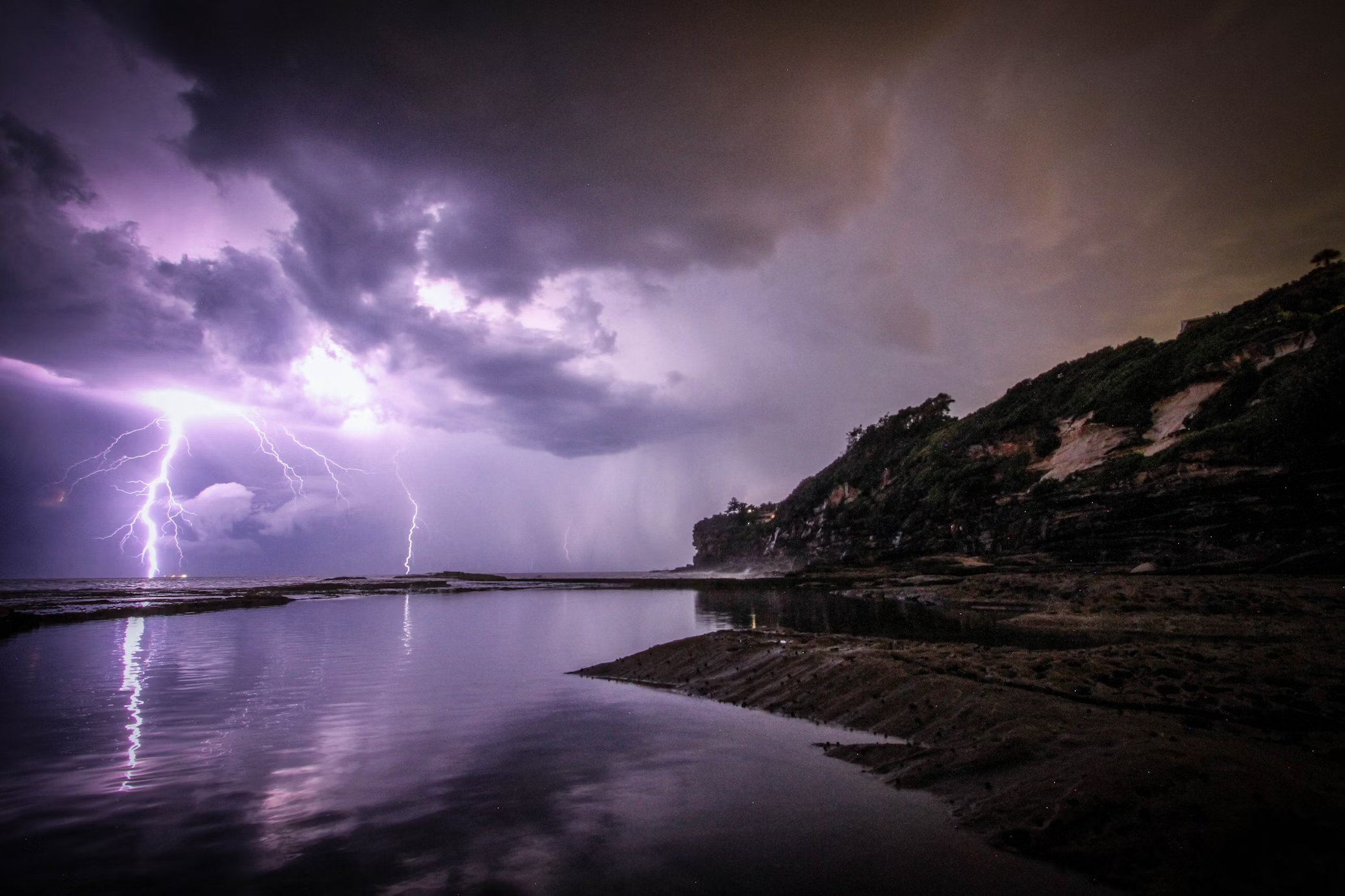 Photo by Jeremy Bishop on Unsplash. Color photo of lightning and thunderclouds over a bay.